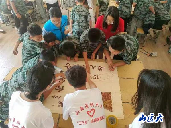 慰问期间,王宏伟一行视察了实践服务队为当地困境儿童举办的暑期夏令营野外生存主题活动,参观了实践队员们与孩子们共同完成的以“爱国爱党”为主题的“豆子画”制作过程。孩子们在野外生存教练和实践队队员的指导下,学习绳结系统的使用等生存技能。