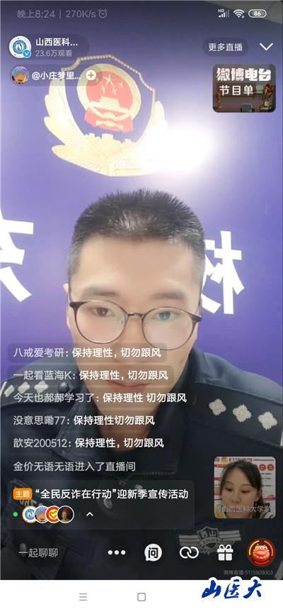 9月19日晚七点半,直播迎新活动第四弹“庄警官说反诈”开播。校团委联合学生处,特别邀请晋中市公安局高校分局东校区派出所副所长庄敬国警官为新生们开展了一场特殊的反诈讲座。经验丰富的庄警官从网络交友,在线兼职,电信诈骗等多个方面进行了反诈宣传,并引入真实案例让反诈内容更加贴近大学生生活,更让同学们在享受多姿多彩的大学生活同时提高警惕,树立起反诈意识。