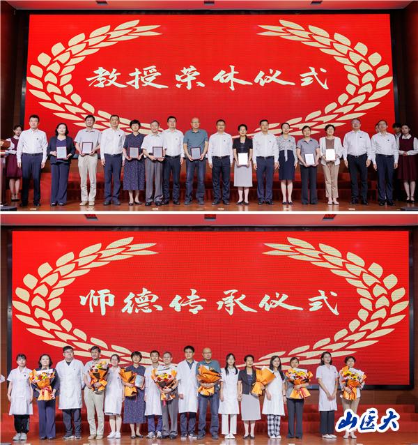 广大教师秉承优良传统,愿做春泥,甘当绿叶,用渊博的知识、深厚的修养、美好的时光、无限的热爱滋养着一批又一批山医学子,为学校教育事业发展作出了巨大贡献。在教师荣休和师德传承仪式上,青年教师为荣休教授赠送鲜花,荣休教授为青年教师佩戴校徽,互赠祝福。师道相承,青蓝同心,彰显了一代代山医人的奋斗与坚守。