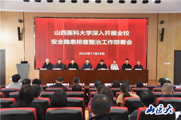11月19日下午,学校在迎泽校区召开深入开展全校安全隐患排查整治工作部署会,深入学习贯彻习近平总书记关于安全生产重要论述和对吕梁市火灾事故的重要指示精神,认真传达省委常委会(扩大)会议暨全省持续深入开展安全隐患排查整治工作会议精神,全面部署我校安全隐患排查整治工作。全体校领导,各部门、各单位、各院系中层干部正职(含主持工作副职),第一临床医学院、第二临床医学院分管安全工作的院领导参加会议。校党委书记王军讲话,校长解军主持会议并讲话,校党委常委、副校长赵文军对全校安全隐患排查整治工作进行了安排。