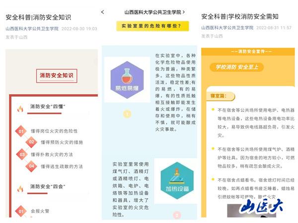 为切实增强学生的消防安全和实验室安全意识,提高安全防范能力,8月30日-9月1日,公共卫生学院组织开展了安全科普宣传活动,在学院微信公众平台推送三期消防安全和实验室安全科普知识,同时面向全院学生开展安全科普宣传教育。