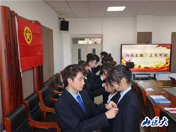 老团员为新团员颁发团章、团员证,并佩戴团徽。