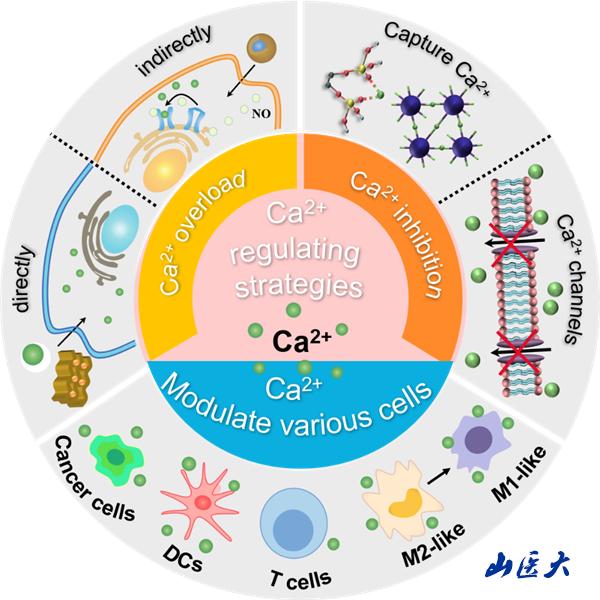 基于钙离子的纳米材料可被用作干扰剂而破坏细胞的钙离子稳态,通过诱导钙超载来促进肿瘤细胞死亡,或通过降低胞内钙离子水平而逆转肿瘤的耐药性。钙超载可导致线粒体功能障碍、ROS水平升高、细胞膜和细胞器膜损伤和细胞骨架破坏,从而导致肿瘤细胞死亡。然而,肿瘤细胞中的高水平的钙离子可导致耐药性。因此,使用钙离子拮抗剂和小干扰核糖核酸以可控方式降低胞内钙离子水平则可逆转这种耐药性。降低胞内钙离子水平可以降低线粒体膜电位,促进肿瘤细胞凋亡,抑制肿瘤转移,并使耐药肿瘤对化疗药物敏感。此外,钙基纳米材料还可以用于干预免疫细胞的钙离子稳态,增强免疫力,促进癌症免疫治疗。