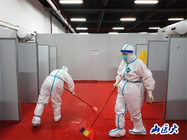 队员们来自不同科室,但很快建立起默契,组长也根据队员的特点与专长进行了分工,使得小组内每一项工作得以顺利高效完成。我们还同时承担舱内的保洁工作,几十个卫生间逐一进行清扫、消毒,一圈下来汗水在防护服里直流,但看着整理后的卫生间整洁干净还是有满满的成就感,也忘却了疲惫。