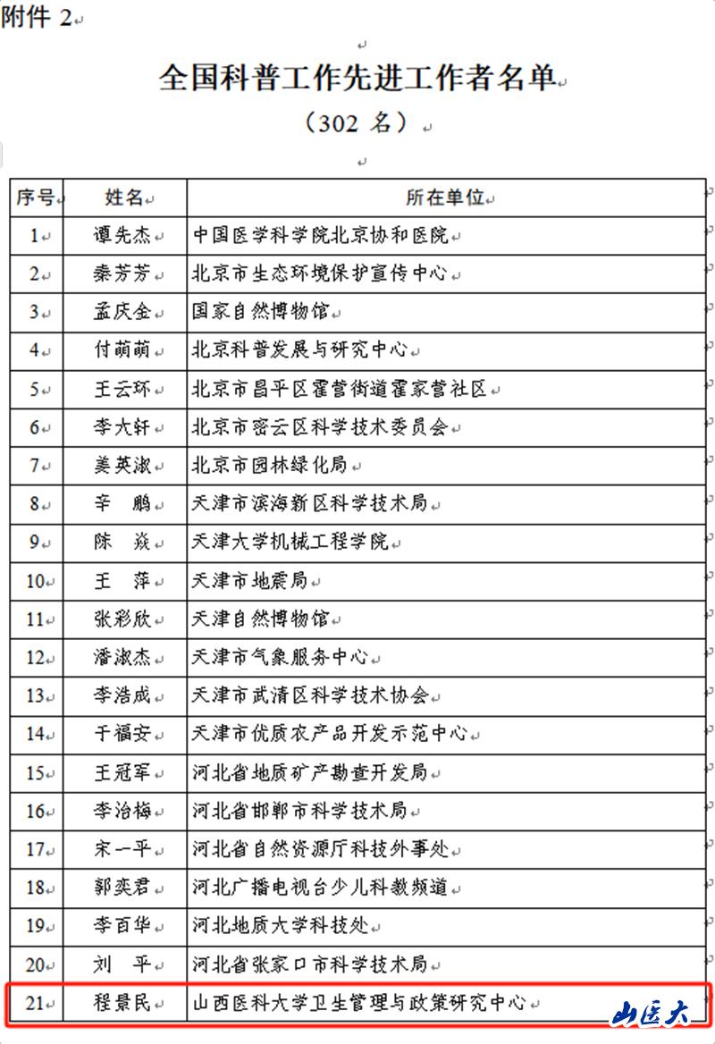 8月22日,科技部、中央宣传部、中国科协发布了《关于表彰全国科普工作先进集体和先进工作者的决定》,决定对2020年以来在科普工作中作出突出贡献的195个单位授予“全国科普工作先进集体”称号,302名个人授予“全国科普工作先进工作者”称号。我校程景民教授入选“全国科普工作先进工作者”。