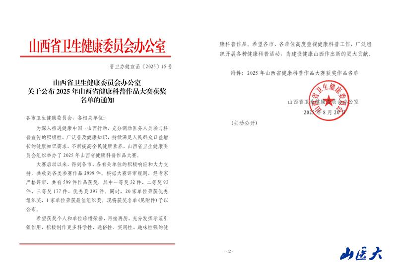 8月20日,省卫生健康委员会公布了2025年山西省健康科普作品大赛获奖名单。我校第二医院在此次大赛中成绩斐然,共报送160部作品,其中25部作品荣获各类奖项,同时医院荣获优秀组织奖。