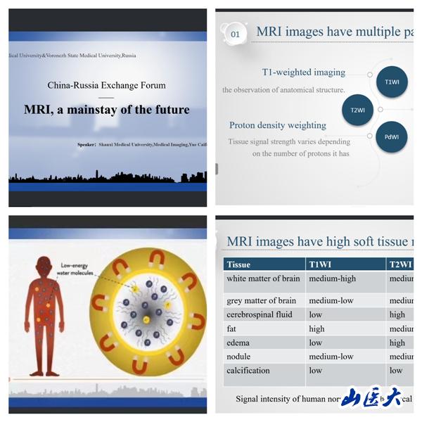 王效春在致辞中详细介绍了我校影像学院的发展历程和成就,表示希望中俄两国同学们在此次学术活动中,学习知识、分享心得、收获友谊。随后,我校影像学院岳采凤和王佳同学,分别以《磁共振成像:未来支柱》和《磁共振成像医学》为题,用流利的英语介绍了磁共振成像的基本原理、成像特点、病例解析、临床意义和未来发展,积极与参会同学开展互动和交流。