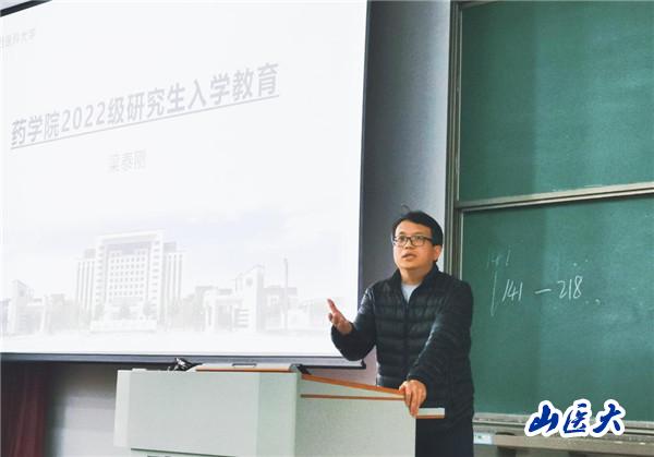 梁泰刚为研究生们详细介绍了学校、学院及学科的基本情况,讲解了研究生培养的基本流程。分别向在学校实验室进行科研工作的同学、在药厂实习的产业学院的同学及在医院实习的医学科学院的同学就研究、实习工作的不同做了介绍。对同学们的选题开题、中期考核及毕业论文的完成作出了规划和殷切期望,同时强调了学术诚信需贯穿始终,绝对不能逾越。